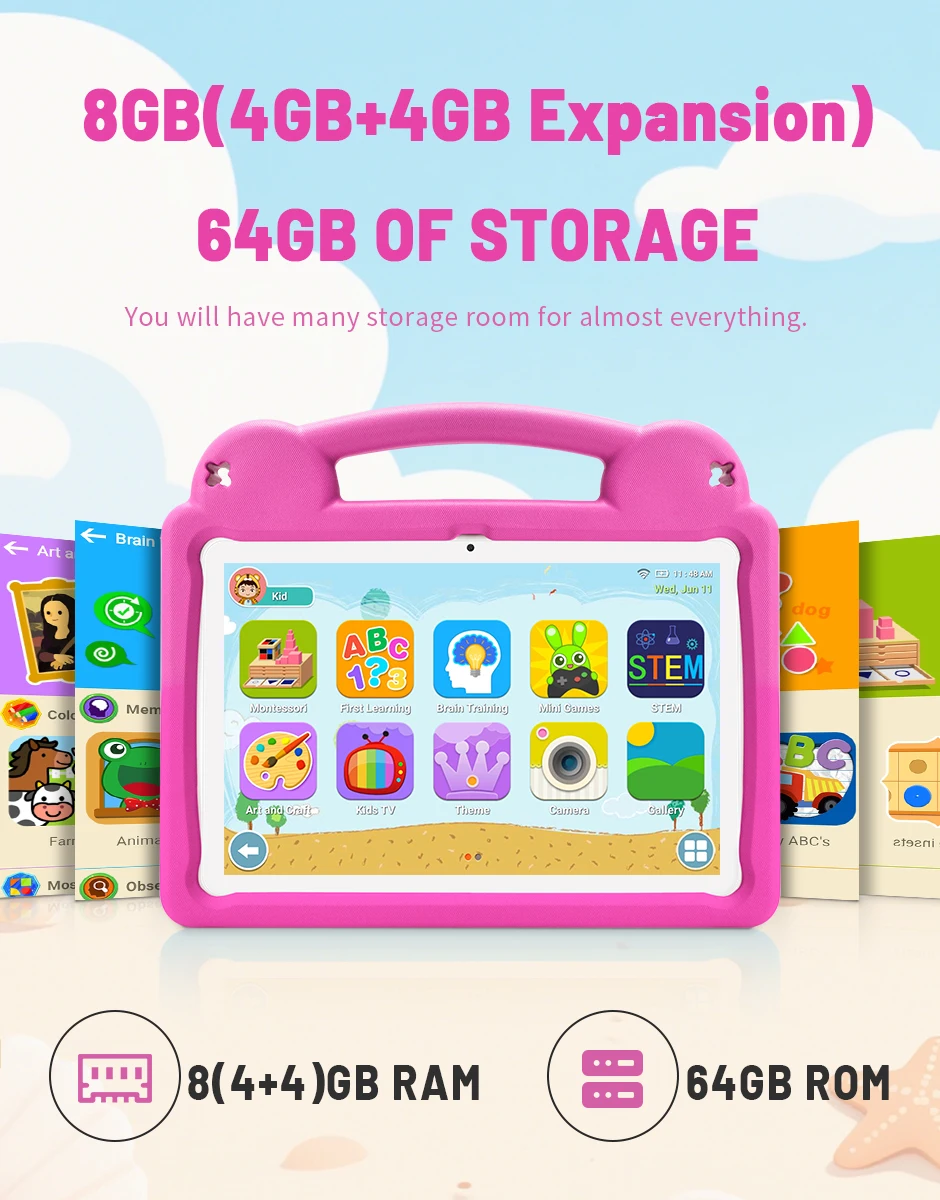 Equipped with 64GB of storage, the tablet can hold a vast library of educational apps, books, and media for endless entertainment.